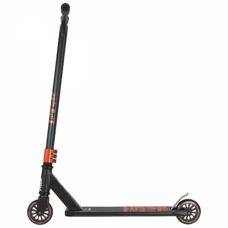 Trottinette, noir, plateau en aluminium et acier renforcé, poignées en gripr, rues 10cm en roulements abec 9 chromées, frein arriere souple, fourche avec systeme de compression SCS.